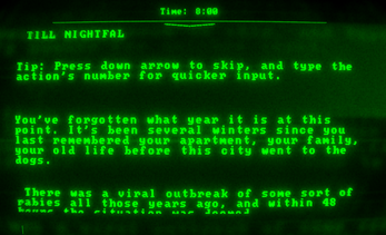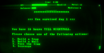uses the timeless genre of text based games to explore a fasinating story set in an apocalyptic world, where very few things prevail. Through your desicions, you are to sustain yourself, or employ your inevitable demise.